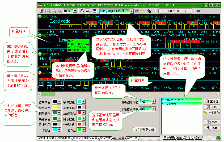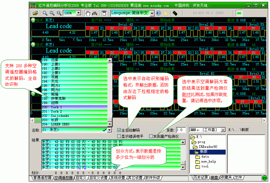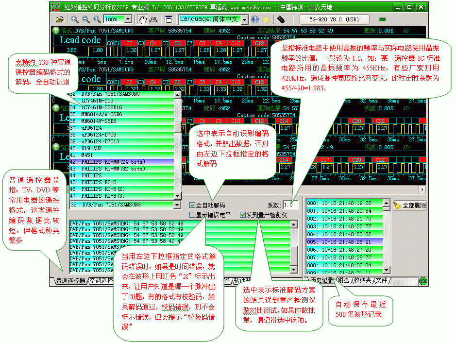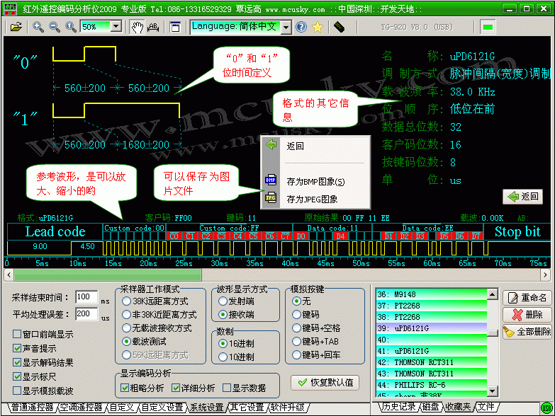 [注解2] [自定义解码方案] 大部分遥控器是利用脉宽调制编码的,它们只是脉冲宽度、系统码、用户码、功能码定义方法不一样,称对这部分遥控器,自定义解码方案允许用户自己定义解码方法,以用在未知的遥控器类型上。 方案名称 取与编码类型相关的名称。 引导脉冲低电平、高电平 引导脉冲由一个低电平和一个高电平组成,低电平在前,高电平在后,单位为us,一般大于100us,不必输入单位,如设为1000us,直接输入'1000'即可。如果没有引导脉冲全部设为0。 比特0低电平、高电平 一个比特0由一个低电平和一个高电平组成,低电平在前,高电平在后,单位为us,一般大于100us,不必输入单位,如设为1000us,直接输入'1000'即可。 比特1低电平、高电平 一个逻辑1由一个低电平和一个高电平组成,低电平在前,高电平在后,单位为us。一般大于100us,不必输入单位,如设为1000us,直接输入'1000'即可。 误差范围 电平正负误差范围,如比特0低电平设为'500', 比特0高电平设为'1000',误差范围设为'200',当收到脉冲的低电平范围在300到700之间,高电平范围在800到1200之间,被认为是比特0。如果一个脉冲同符合逻辑0和逻辑1,则优先解成逻辑0。 划分方式 一般一串码按引导码、系统码、用户码、功能码等分开,它们各占其中的几位,显示解码结果时会将它们分开显示,如"8,8,8,8"表示某遥控器按8位系统码、8位系统反码、8位功能码、8位功能反码组成。每一项必须大于等于1,小于等于32,用分号隔开。 低位在前 遥控器先发低位还是高位。 勿略错误位
