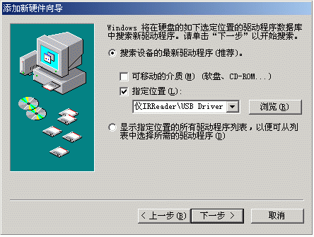 [红外遥控编码分析仪2011专业版 + YG-920 V6.0快速安装使用指导] 2、 如果用串口连接,采样器插上9V电源,用串口线把采样器连到电脑COM1或COM2,跳到第5步。 3、如果采样器支持USB接口,用USB线把采样器连到电脑,采样器不需另外插电源,电脑报告说找到新硬件,选择如图: 出现以下界面,选择“指定位置”,按“浏览”键选择驱动程序目录“IRReader2011\USB Driver” 点击“下一步”直到安装结束。有时可能需要重新启动电脑。 4、右键点击桌面“我的电脑”,选择“属性”,点“设备管理器”,展开“端口(COM&LPT)”,可以看到“USB to Serial Port (COM3)”,表示采样器接到了COM3,再运行红外遥控编码分析仪,端口选择COM3就可以正常使用了,不同的电脑或不同的USB口可能不是COM3,也可能是其它比如COM5。