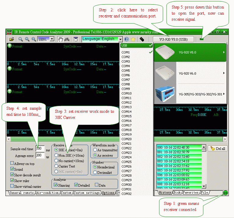 ¡¡ [system requirements] 1. Intel® Pentium® II or AMD Athlon processor (1GHz,256MB). 2¡¢Microsoft® Windows® Win98, WinMe, WinNT, Win2K, Win2003, WinXP, Vista. [Fast installation for IR Remote Control Code Analyzer 2012 - Professional & YG-920 V12.0] 1. Copy the directory "IRReader2012" to your harddisk, remove all attributes of all files, or run setup.exe. 2. If using RS-232, please plug in DC9V,connect RS-232 port to COM1 or COM2, goto step 4. 3. If using USB port, connect USB port to PC's usb port, PC will auto install driver for receiver. 4. Run "IRReader.EXE", refer to step 1 to step 5 below. Next: