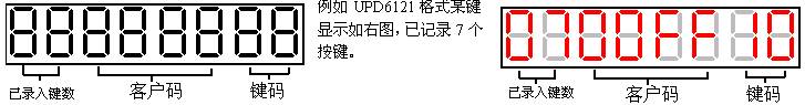 选择键:用于选择工作模式,共分为五种工作模式:"普通模式"、"录入模式"、"校对测试模式"、"联机模式"、"统计模式",循环选择。 自动键:自动键按下,读码器将自动识别编码格式;自动键弹起,将锁定在当前格式,可以提高测试速度。 无载波键:压下为无载波模式,用于测试无载波的格式,如M708,测试距离<20cm。 普通模式:按"选择键"到"普通"指示灯亮进入普通模式,在普通模式下可以测遥控器的客户码、键码以及所属格式编号,显示如下图,每次正确解码均有短BEEP声提示。 录入模式:按"选择键"到"录入"指示灯亮进入录入模式,"录入模式"是为配合"校对测试模式"而工作的,在一批遥控器批量比对测试之前,必需在"录入模式"中完整录入一只"好的遥控器"的按键数据,用于校对测试,右边两位数码管显示键码,中间四位数码管显示客户码,左边两位数码管显示已录入的按键数量(最多可录入99只按键,所以一支遥控器的按键不能超过99只),使用时按一下遥控器,数码管显示按键数据,按一下检测仪上的"多功能"按键进行确认,数据被保存,已录入按键数量加1,返复操作直到所有按键已被录入,就可以进入"校对测试模式"。按住多功能键2秒钟可全部清除已录入的按键数据。所录入的数据掉电后可以继续使用。 校对测试模式:按"选择键"到校对指示灯亮进入校对模式,校对测试是为批量测试遥控器而设计的,为测试工人提供了一种高效准确的傻瓜式测试方法,测试按键顺序必须按录入时的顺序测试,否则报告错误,右边两位数码管显示录入时按键序号,当解码错误显示"Er",左边六位数码管显示格式名称(如:6121,50462等),每次正确解码均有短BEEP声提示。当所有按键已测完无误,会有长BEEP声提示,数码管显示"PASS",当测试过程未完成之前按多功能按键可重新开始校对测试一支新遥控器。 联机模式:按"选择键"到"联机模式",数码管显示"CON PC"如下图,检测仪将把收到的波形通过串口发送到电脑上显示,电脑软件与"红外遥控编码分析仪"共用,请在www.mcuksy.com下载,与"红外遥控编码分析仪"相比,数码管遥控器检测仪只能显示简单的波形。 统计模式:按"选择键"到"统计模式",数码管显示"Gd 88",表示已测试有88支好的遥控器,按一下"功能键",数码管显示"Er 1",表示已测试到1支坏的遥控器。长按"功能键"2秒钟,清0统计数据,统计数据掉电自动保存。