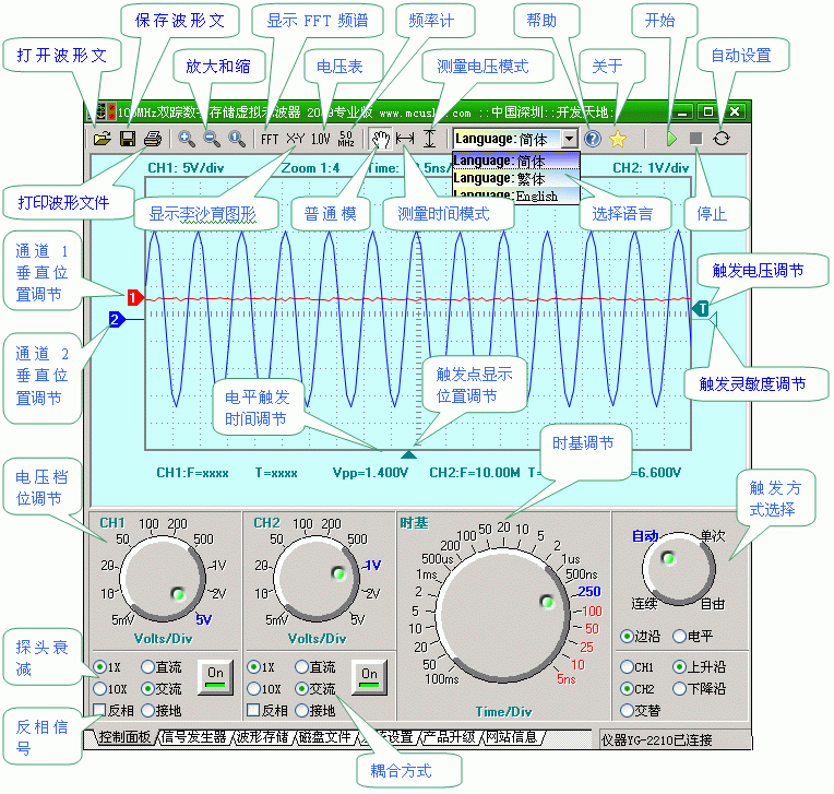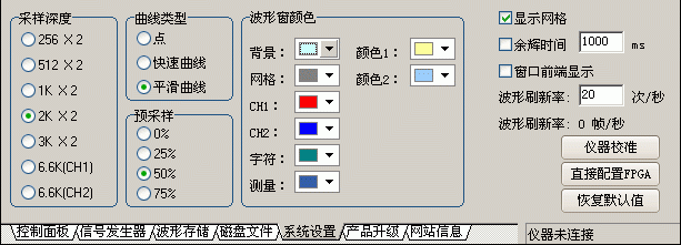 采样深度:支持7种采样深度,采样深度小一点可以提高传输速度,注意设为6.6K时只支持单通道。 曲线类型:点-->绘制波形时,每个样本用一个表示。快速曲线-->绘制波形时,用普通绘图方法把所有样本连起来。平滑曲线-->绘制波形时,用平滑曲线把所有样本连起来,相对快速曲线,这种方法有很好的视觉效果,但速度相对慢一些。 预采样:就是触发点之前的信号也被采样,让我们可以看到触发点之前的信号,一般数字示波器才具有此功能,而传统的模拟示波器是无法做到的。支持4种预采样值。 余辉时间:模仿模拟示波器的荧光显示效果。 仪器校准:进入仪器校准界面,可以校准每个通道每个量程的0点、增益等。每台仪器出厂前都经过校准,校准参数存放在仪器中,校准参数是非常重要的,如果调错了会影响仪器的正常使有,用户应谨慎使用此功能,新仪器最好点击“另存为”键把校准参数保存到电脑中,万一调乱了,可以按“打开”键从电脑下传到仪器中。 [产品升级]