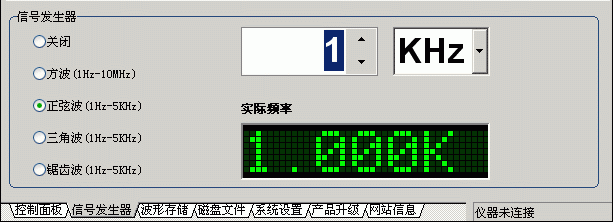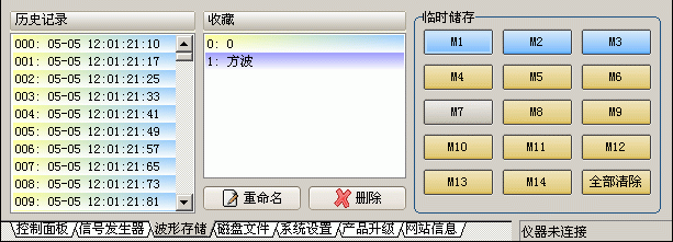 信号发生器可以产生四种类型的波形,幅值为0.0V-3.3V,通过仪器的前端端子输出,用于校验仪器或者输出到其它地方,信号发生器并不能输出任意频率的波形,而是根据分频系数自动计算一个最接近的频率值,注意:不使用信号发生器时,建议把它关闭,以免造成干扰,特别是产生高频信号时。 [波形存储]