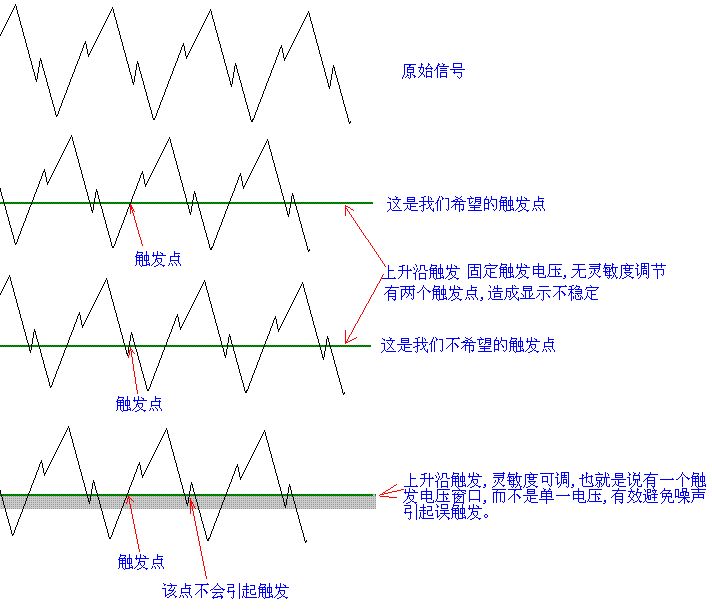 [触发灵敏度] 由于信号在激励、传输和检测过程中,可能会不同程度地受到随机噪声的污染(尤其是小信号的采集和测量),从混有噪声的信号中提取有用信息、防止误触发是非常重要的,所以本仪器设有触发灵敏度调节功能,有效滤除有可能叠加在触发信号上的噪声,并防止误触发,稳定显示信号,触发灵敏度可以通过鼠标直观的、连续调节。原理如下: