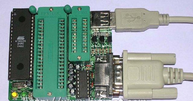 <A51单片机编程器>可以烧录Atmel公司系列单片机芯片,具有性能稳定,烧录速度快,性价比高等优点,支持目前最为经典和市场占有量最大的ATMEL公司生产的AT89C51、C52、C55和最新的S51、S52;AT89C1051、2051、4051等芯片。特别适合于渴望学习51单片机又想尽量减小学习投入的网友。毕竟51系列早已经成为了工业标准,学习51单片机,使一切都在单片机的控制下变得智能化,是每一个爱好者和发烧友的梦想!1.使用串口通讯,芯片自动判别,编程过程中的擦除、烧写、校验各种操作完全由编程器上的监控芯片89C51控制,不受PC配置及其主频的影响,因此烧写成功率高可以达到100%,烧写速度很快并且烧写速度和微机的档次无关。