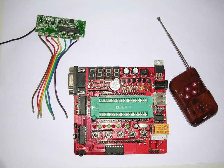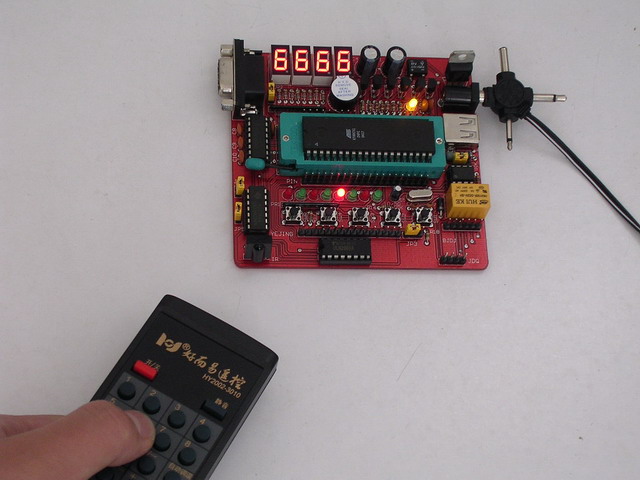 10.带红外接收头,可以做红外线解码实验,红外线遥控器等等,酷!!!配合SAA3010T遥控器完成遥控解码及红外遥控实验。如:按遥控器的数字键1——8,即可点亮实验板上的第一个发光管至第八个发光管。当然,你也可以通过改动程序来达到红外遥控其它资源的目的。 |