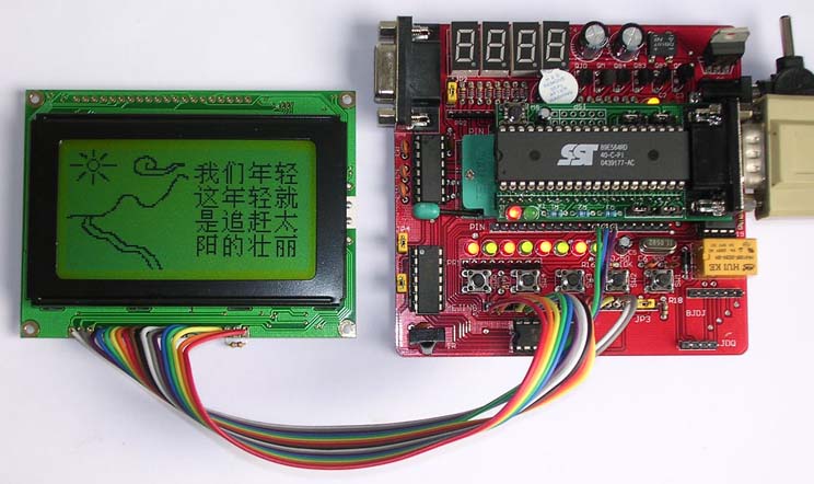 增强型实验板配合12864液晶屏完成的中文显示及图形画面显示实验照片,从图中可以看出实验板的灵活性,外接元件非常方便,任你接驳。