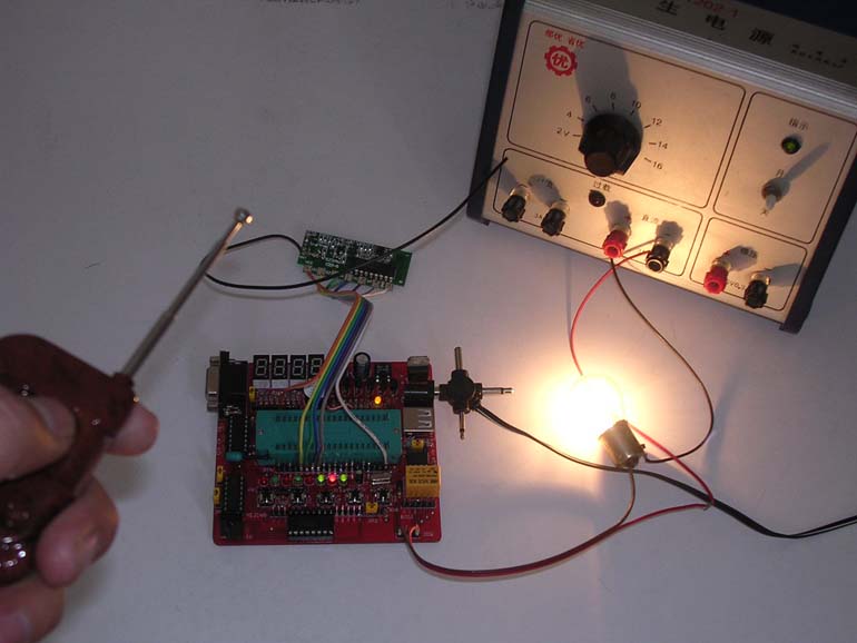 增强型51实验板通过无线遥控收发模块来控制灯泡的实验酷照